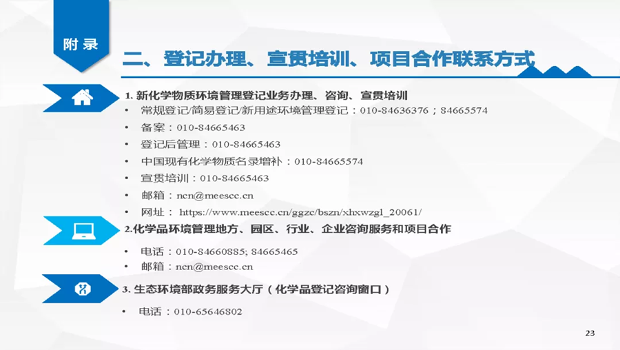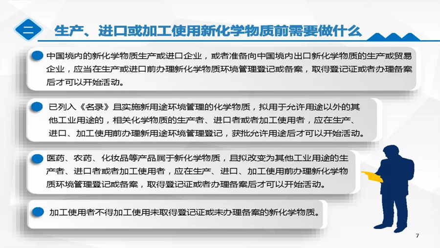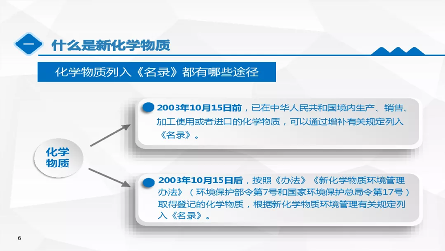 (1)首先核查企業(yè)經(jīng)營(yíng)的化學(xué)物質(zhì)是否屬于新化學(xué)物質(zhì),自查請核對MEP頒發(fā)的2013版IECSC及后續的5次公告增補列入IECSC的目錄清單,或者委托固體廢物與化學(xué)品管理技術(shù)中心(SCC)進(jìn)行查新。如果是新化學(xué)物質(zhì)或者屬于新用途管理類(lèi)的現有化學(xué)物質(zhì),建議盡快準備登記或備案。